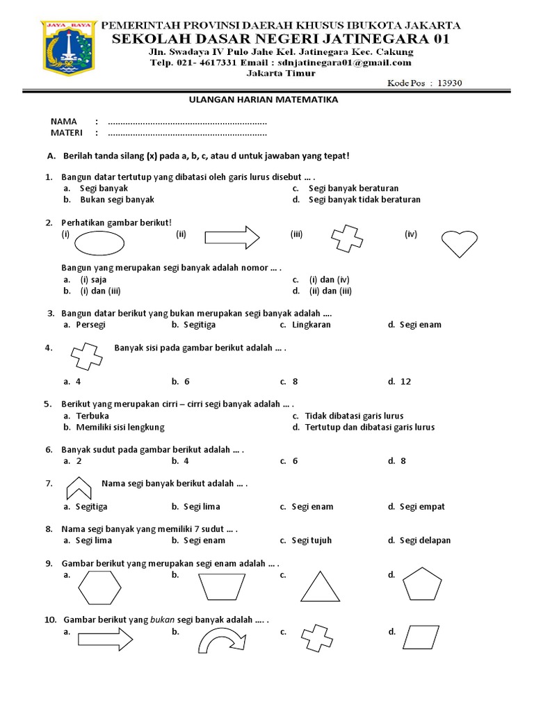 Soal Pts Uts Matematika Kelas 4 Semester 2 K13 Tahun Ajaran 2018 2019 Juragan Les from 2.bp.blogspot.com Derajat merupakan pangkat tertinggi dari variabel yang terdapat pada suku banyak. Macam macam segi banyak secara umum bangun segi banyak dibedakan menjadi 2 macam, yaitu beraturan dan tak beraturan. Segi banyak paling sedikit memiliki tiga sisi. Keliling bangun datar dan las lingkaran. Segi banyak merupakan bangun terbuka yang memiliki banyak sisi. Mar 25 2021 download soal ulangan harian matematika kelas 4 bangun segi banyak. Nah, pada kesempatan kali ini kita akan membahas tentang bangun segi banyak yang merupakan materi matematika kelas 4 kurikulum 2013 revisi 2017. 49 soal segi banyak kelas 4 sd semester 2 pictures unduh file guru.